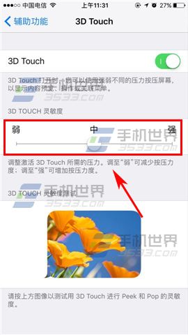 2)接著點擊【3D Touch】,最後我們再根據自己的需要進行調整3D Touch的靈敏度就可以了。(如下圖)