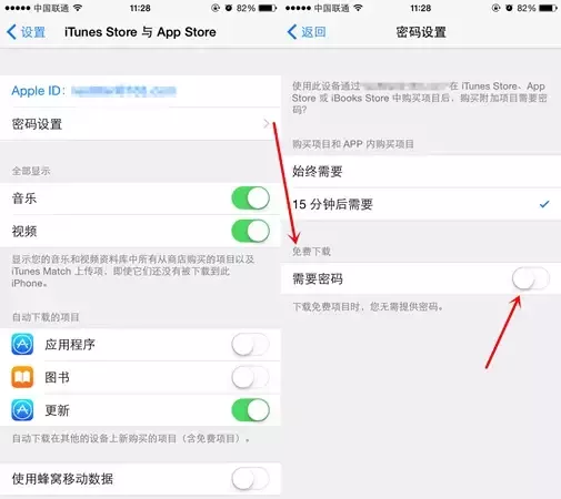 然後,進入“設置>iTunes store與App store”,在Apple ID的下面就增加一個“密碼設置”的選項。進入之後,關閉“免費下載”即可!以後下載免費軟件時,就不需要輸入密碼了!