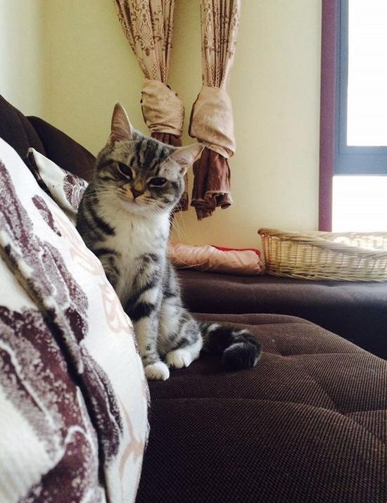 可以選擇在沙發上拍攝貓咪,貓咪毛色搭配褐色的沙發,將寵物的姿態和神情突顯出來,