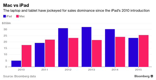 彭博社統計了2010年以來MacBook和iPad的銷量,其中iPad的銷量在2013年後放緩,MacBook的增速也在放緩。蘋果公司Mac產品線,包括MacBook Pro,在過去一個財年增加了6%,總銷售達到255億美元,而iPad的銷售額下降23%,目前為232億美元。蘋果公司的研究認為iPad產品的升級周期是三年,而iPhone則是18-24個月,在iPad Pro證明其價值後,MacBook Pro的更新就是為了吸引iPad的部分用戶。