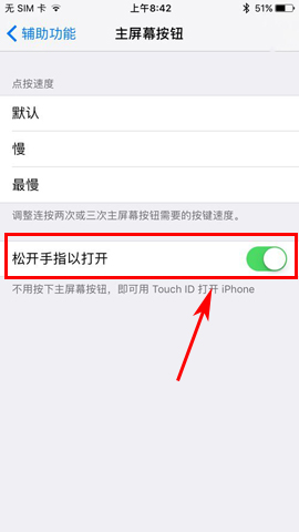 在IOS10開發者預覽版Beta3,蘋果對這一點進行完善,現在,當用戶打開設置-輔助功能-主屏幕按鈕中的“松開手指以打開”選項後,使用Touch ID進行解鎖將直接進入主屏幕,無需按下Home鍵。此外,在Beta3中,iPhone(僅iPhoneSE、iPhone6s、iPhone6s Plus可開啟“抬起亮屏”)還可以配合開啟抬起喚醒,手指直接放在Home鍵上,然後拿起手機即可自動亮屏解鎖,無需按下。(如下圖)