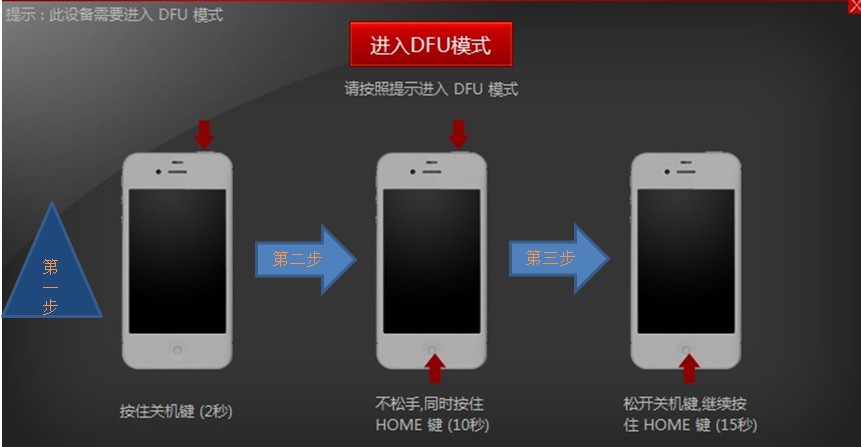 注:如果出現手機黑屏,iTunes未識別,開機鍵/電源鍵按了以後沒有反應,此時為假DFU模式,需要按住開機鍵/電源鍵+HOME鍵15秒將iPhone強制關機,然後再從第二步開始操作進DFU
