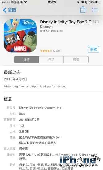 下面給大家介紹的就是根據第三種方法演變而來,大家都知道大陸地區的itunes store登不上了,沒事,我們的app store還能登錄上,當手機剩余內存1G左右的時候打開app store,下載這個軟件(Disney Infinity:Toy Box 2.0,其實不一定要這個,只要所需空間大小2-3G以上即可),手機下載不了,因為內存不夠,別急,這時候ios系統正在清除手機緩存,重復幾次能清理出幾個G的空間,最後祝大家用的愉快!