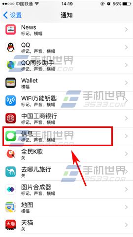 1)首先我們先打開【設置】,然後找到【通知】,打開後我們再點擊【信息】。(如下圖)