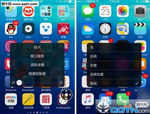 之後,點按三下 Home 鍵就能呼出一個控制器,調整大小到全屏幕覆蓋後,通過‘選取濾鏡’中‘弱光’選項,再隱藏控制器即可。
