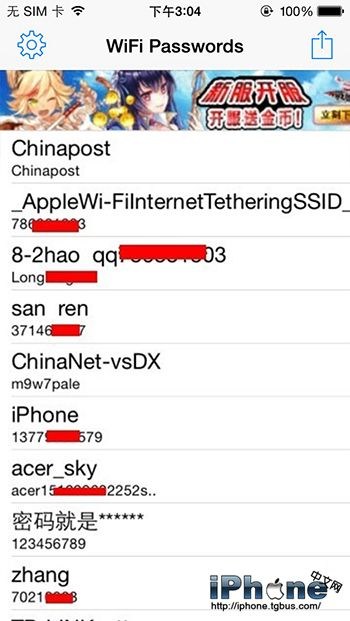WiFi Passwords的使用方法很簡單,安裝成功後,打開WiFi Passwords就能看到所有連接過的WiFi及密碼了。