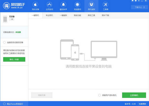 1、首先下載安裝最新版愛思助手,用數據線把設備連接電腦;點擊上方“刷機越獄”進入到“一鍵刷機”界面。連接成功會自動匹配固件。(如果設備狀態提示連接超時可以把設備進入恢復模式或DFU模式,連接後也會自動匹配固件並且可以刷機)