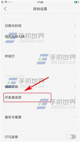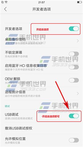3)點擊【開發者選項】,打開後我們再把【USB調試】那欄右邊的橢圓往右拉打開即可。(如下圖)