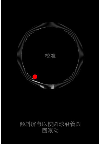 3.【校准】的操作就是將手機持水平放置,然後向四周輕微的轉動屏幕,讓屏幕中的小點點繞四周移動。