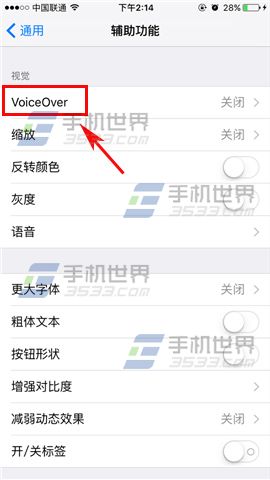 2)接著點擊【VoiceOver】,最後將其旁邊的橢圓往右拉打開即可。(如下圖)