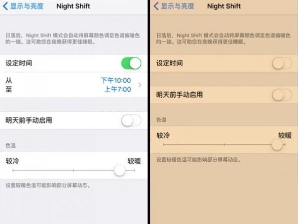 你可以選擇固定時間段內開啟,而Night Shift模式也貼心地支持從日落到日出時自動開啟(需要開啟定位功能)。