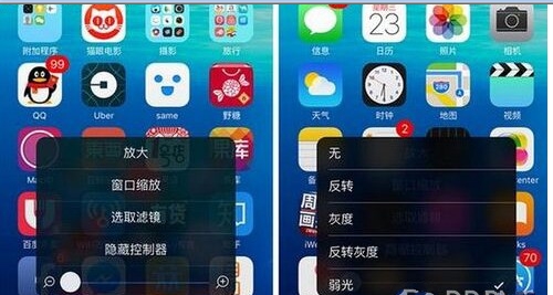 之後,點按三下Home鍵就能呼出一個控制器,調整大小到全屏幕覆蓋後,通過‘選取濾鏡’中‘弱光’選項,再隱藏控制器即可。