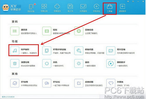 (1)使用xy蘋果助手設置自定義鈴聲:在工具箱裡找到鈴聲制作按鈕,直接點擊