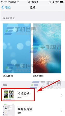 4)打開後我們再點擊【選取新的牆紙】,然後點擊【照片】選擇之前保存的壁紙。(如下圖)