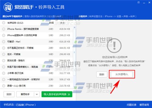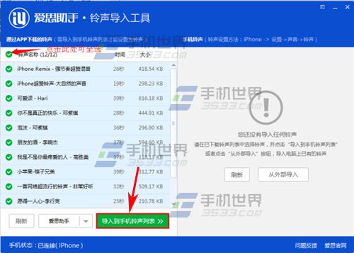 2)用數據線將蘋果iPhoneSE和電腦連接,選擇剛才下載的鈴聲並點擊【導入到手機鈴聲列表】。(如下圖)