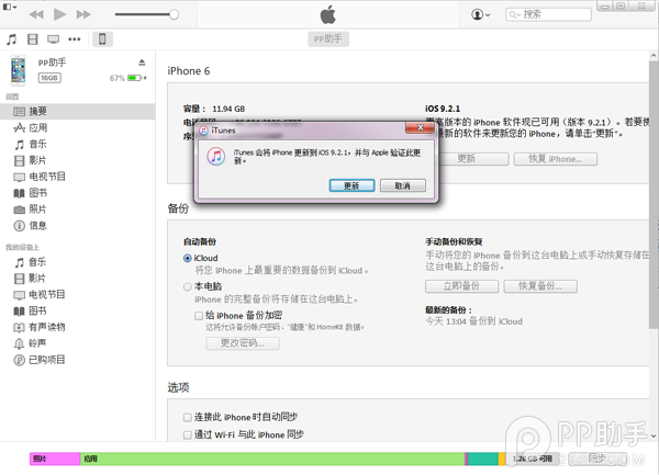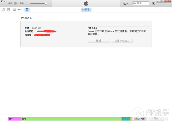 2、設備連接至iTunes,進入設備界面,點擊【更新】,等待iTunes下載最新版iOS9.2.1並進行自動更新升級即可。