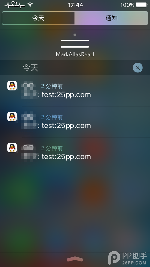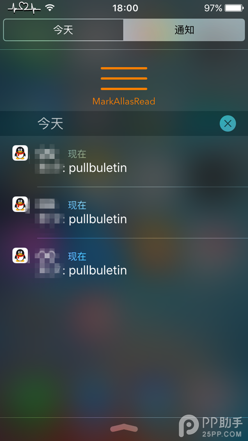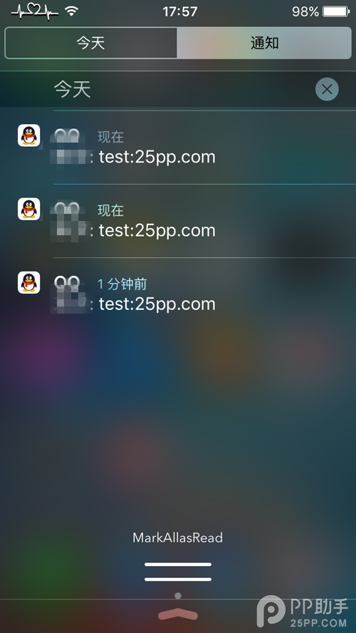 2、打開通知中心,往上拉或往下滑動時可以看到一個【MarkAllRead】的標識,當下拉/上滑至黃色字樣之後,通知信息將被全部清除。