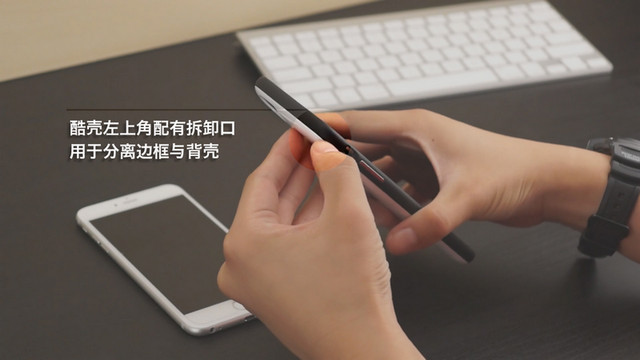 酷殼iPhone6 Plus款采用邊框與後殼分離的設計,安裝時需要先將邊框卸下。