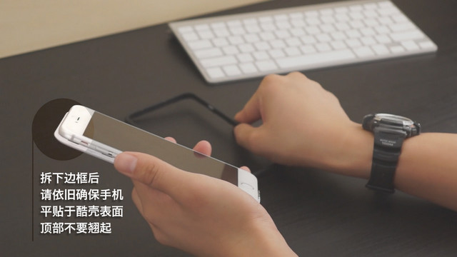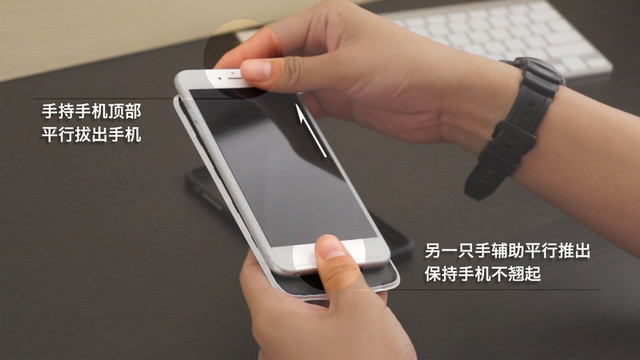 在取下邊框的過程中,確保手機平貼放於酷殼上,不要讓手機翹起,以免損傷底部LightSync端子。