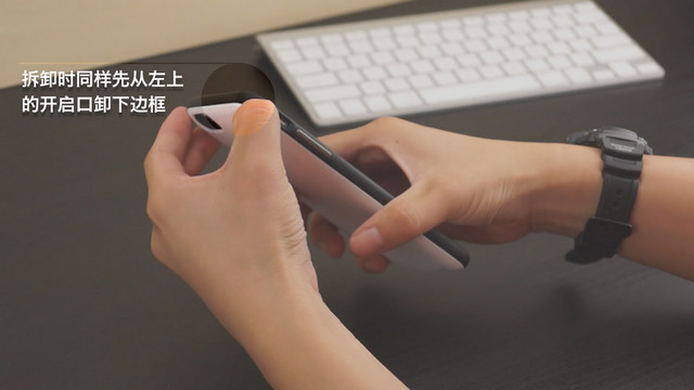 拆卸時,同樣從邊框左上的開啟口開始,用手指向兩邊劃開,取下邊框。