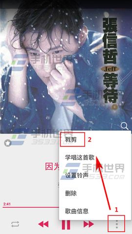 1)首先我們先打開自帶的【音樂播放器】,然後選一首你喜歡的歌開始播放,接著點擊右下角的【三點】,然後點擊【裁剪】,歌曲播放過程中,紅色線條為播放進度,可在任意時刻點擊標簽按鈕(5)做好記號,標簽6、7分別為想要截取的開始和結束位置。(如下圖)