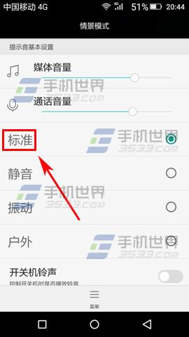 首先我們先打開【設置】,然後找到【情景模式】,打開後點擊【標准】那兩個字,不要點後面那個圓圈,進入設置後我們再把【鎖屏提示音】那欄右邊的【橢圓】往左拉關閉即可。(如下圖)