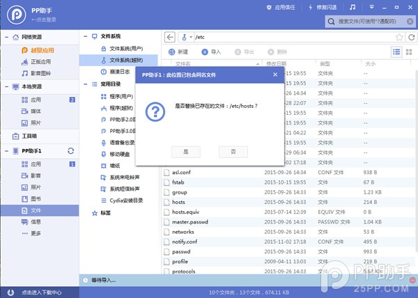 2、設備連接PP助手電腦版,在【文件系統(越獄)】中找到【etc】文件夾,將下載好的host文件導入,選擇替換;