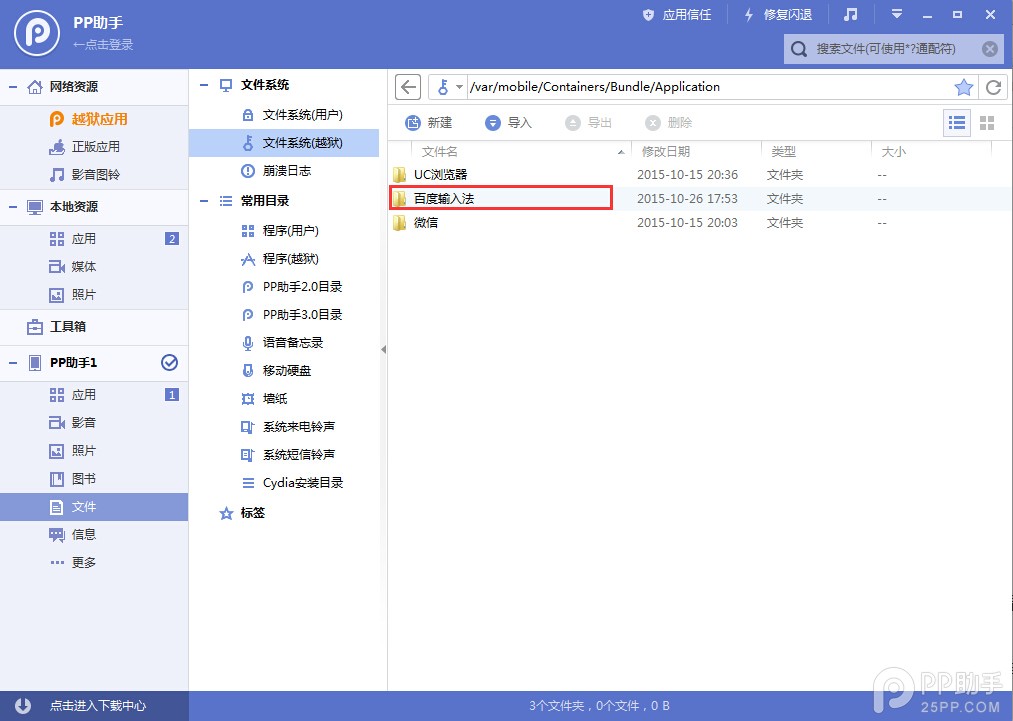 3、設備連接PP助手電腦版,將下載好的文件導入路徑【/var/mobile/Containers/Bundle/Application/百度輸入法/BaiduInputMethodContainer.app】