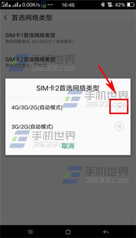 2)接著點選【首選網絡類型】,你可以選擇【SIM卡1】或者【SIM卡2】來設置,當然,是根據你上網的卡來設置的,在彈出框內選擇【4G/3G/2G】一欄即可。(如下圖)