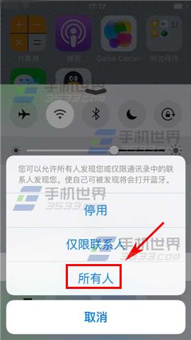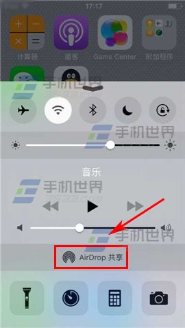 1)在待機界面上拉出控制中心,點擊【AirDrop共享】,再選擇【所有人】。(如下圖)