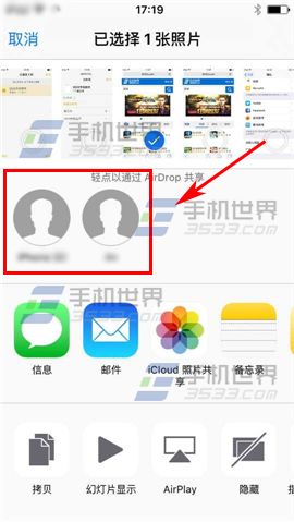 2)進入相冊,點擊照片左下角【分享】按鈕,選擇一個需要傳輸的【頭像】即可。(如下圖)