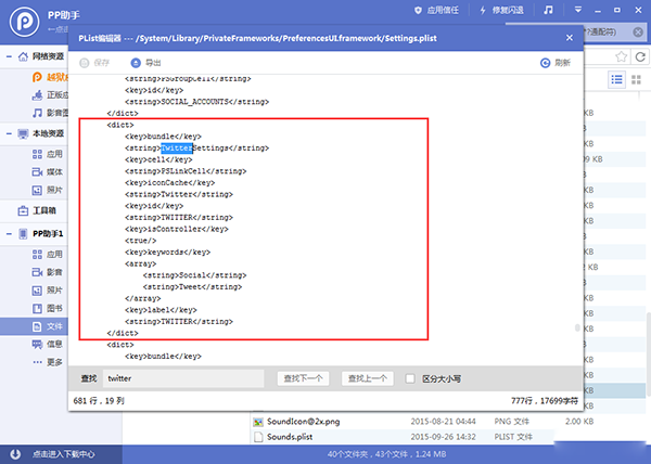 2、刪除以上文件之後,打開【/System/Library/PrivateFrameworks/PreferencesUI.framework】路徑,找到並雙擊打開【Settings.plist】文件,查找【Twitter】,並將相應代碼刪除,然後點擊保存(如下圖所示)