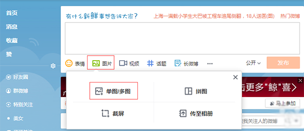 3. 基本上,到了這一步已經接近尾聲了,只要將這張圖片上傳到微博即可。打開微博,點擊圖片 > 單圖/多圖,在彈出的窗口中選中剛剛生成的 GIF 動圖,就可以發布了。
