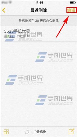 1)點擊進入備忘錄,我們可以看到【最近刪除】一欄,點擊進入後選擇右上角【編輯】。(如下圖)