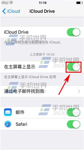 2)接著點擊【iCloud Drive】進入,找到並打開【在主屏幕上顯示】右邊滑塊即可。(如下圖)