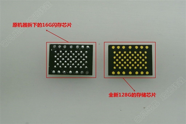 16G的閃存芯片拆掉以後,就可以安裝新的128G閃存了。