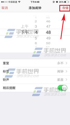 2)打開鬧鐘後點擊右上角的【+】號,添加鬧鐘,然後設一個你所需要的鬧鐘,設完後最後點擊右上角的【存儲】就可以了!(如下圖)