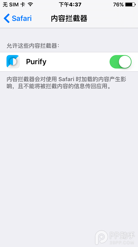 這款iOS9攔截廣告軟件名字叫——Purify,在AppStore上售價3美元,在PP助手正版上可免費下載。(注意:如果在PP助手上下載Purify之後出現閃退,只要將設備連接電腦,用PP助手電腦版“修復閃退”功能就能解決)
