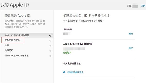 4.登陸之後,我們將看到自己的賬戶個人信息,在左側對話框中選擇“密碼和賬戶安全”,這時候,頁面中將會顯示我們之前所設定的安全提示問題,若想要涉及Apple ID的帳戶安全操作時,必須要輸入事先設置的正確答案。很顯然,這個答案就是我們今天要找回的內容。