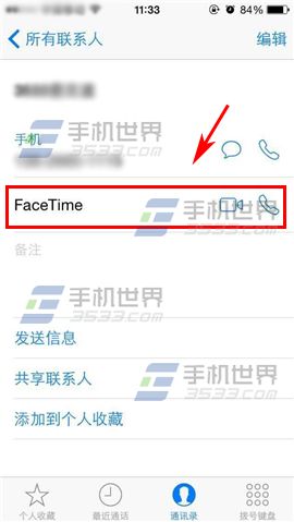 2)在聯系人界面選擇一個【聯系人】,並點擊【FaceTime】即可進行視頻通話。(PS:需要對方的iPhone手機支持FaceTime方可視頻通話)(如下圖)