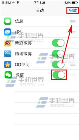 2)把【微信】右邊的按鈕開啟,點擊【完成】,返回上一步點擊【微信】圖標即可分享。(如下圖)