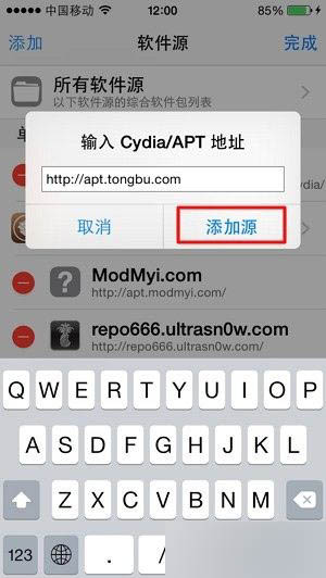 3.在彈出的輸入框裡輸入apt.tongbu.com,點擊添加源
