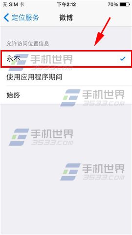 2)選擇一個你需要關閉定位的軟件,這裡以【微博】為例,點擊進入後選擇【永不】即可。(如下圖)
