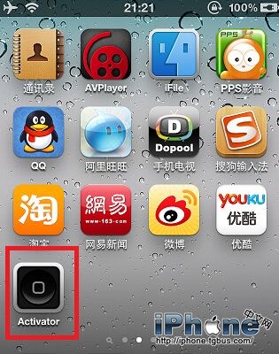 Cydia安裝好Activator之後,我們點擊Home鍵退回到擁有程序圖標的主界面,找到Activator的圖標,點擊進入