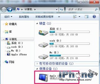 將iPhone連接到電腦,打開“我的電腦”或“計算機”,您可以雙擊打開此圖標,像U盤文件一樣管理照片和視頻(只能顯示照片和視頻)。或者右鍵此圖標,在彈出的菜單中選擇“導入圖片和視頻”,便可將iPhone中所有照片、視頻導入到電腦。