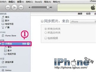 確保您的電腦已經安裝iTunes。打開iTunes,將iPhone連接到電腦。如下圖中的順序進行操作,先選擇側邊欄的iPhone,然後切換到“照片”欄。