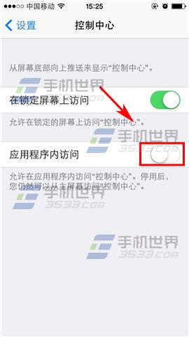 在iphone6plus手機的設置界面選擇【控制中心】,關閉【應用程序內訪問】右邊開關即可。(如下圖)