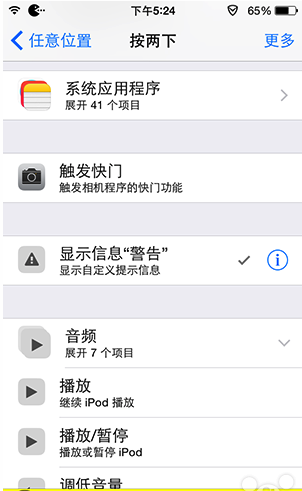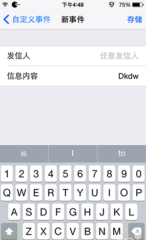 進行【設置】-【Activator】-【任意位置】,點擊右上角的更多,則能夠看到一個【收到信息】的選項,在其中設置發信人以及信息內容,我們暫時將信息內容設定成“dkdw”,確定保存返回至【任意位置】界面,一直往下翻,我們就能夠看到你剛才的收到信息的設置。