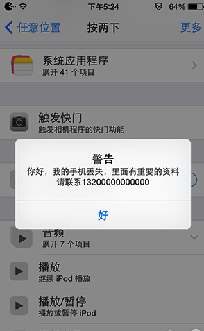 Activator—任意位置——隨便點擊一個手勢進入(我們暫以雙擊狀態欄為例)—右上角更多—顯示信息提示—(自己填寫自己的聯系方式等如:您好,我的手機丟失,裡面有重要的東西請聯系132000000000)—完成。