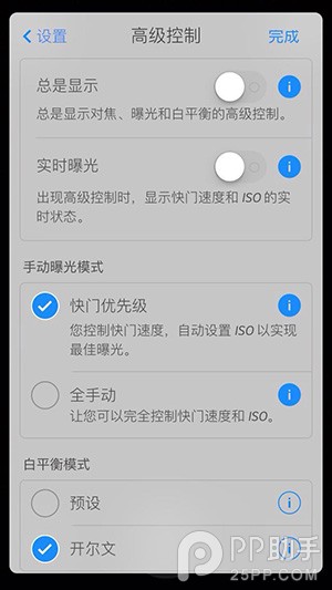 接下來,我們來看看 Camera+ 更多的高級控制選項。點擊應用右下角進入設置如下。